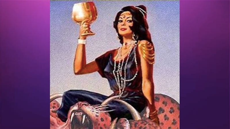 Revelation 17:4-6 The woman was clothed in purple and scarlet, and adorned with gold, precious stones, and pearls, holding in her hand a gold cup full of abominations and of the unclean things of her sexual immorality, and on her forehead a name was written, a mystery: “BABYLON THE GREAT, THE MOTHER OF PROSTITUTES AND OF THE ABOMINATIONS OF THE EARTH.” And I saw the woman drunk with the blood of the saints, and with the blood of the witnesses of Jesus. When I saw her, I wondered greatly.