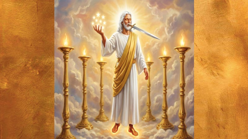 Then I turned to see the voice that was speaking to me, and on turning I saw seven golden lampstands, and in the midst of the lampstands one like a son of man, clothed with a long robe and with a golden sash around his chest. The hairs of his head were white, like white wool, like snow. His eyes were like a flame of fire, his feet were like burnished bronze, refined in a furnace, and his voice was like the roar of many waters. In his right hand he held seven stars, from his mouth came a sharp two-edged sword, and his face was like the sun shining in full strength.